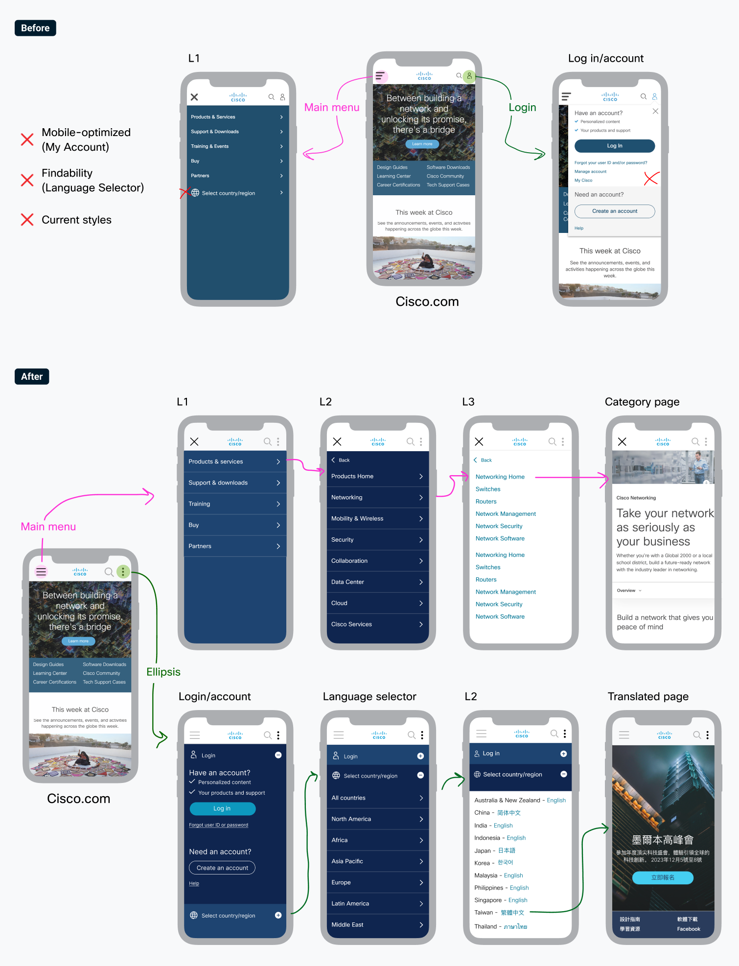 In April 2020, Cisco.com had 26K unique visitors averaging 1.5 minutes on its homepage (Audience Playground, 2020). These visitors are often prospective customers or partners looking to learn more about Cisco products, and use the site navigation as a jumping off point. By looking at click data and also running customer interviews and task-based testing with customers at Cisco Live, the team was able to identify several problem areas to validate updating the navigation.